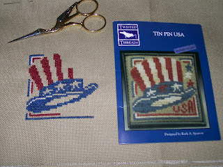 As you know, I have been stitching and blogging. Happily, I share 2 progress pictures of my patriotic UFO. The major reason it's a UFO is because I am stitching it on Cashel linen. I really thought I would like stitching on linen, but I don't. My preference is evenweave, preferrably Jobelan.